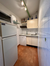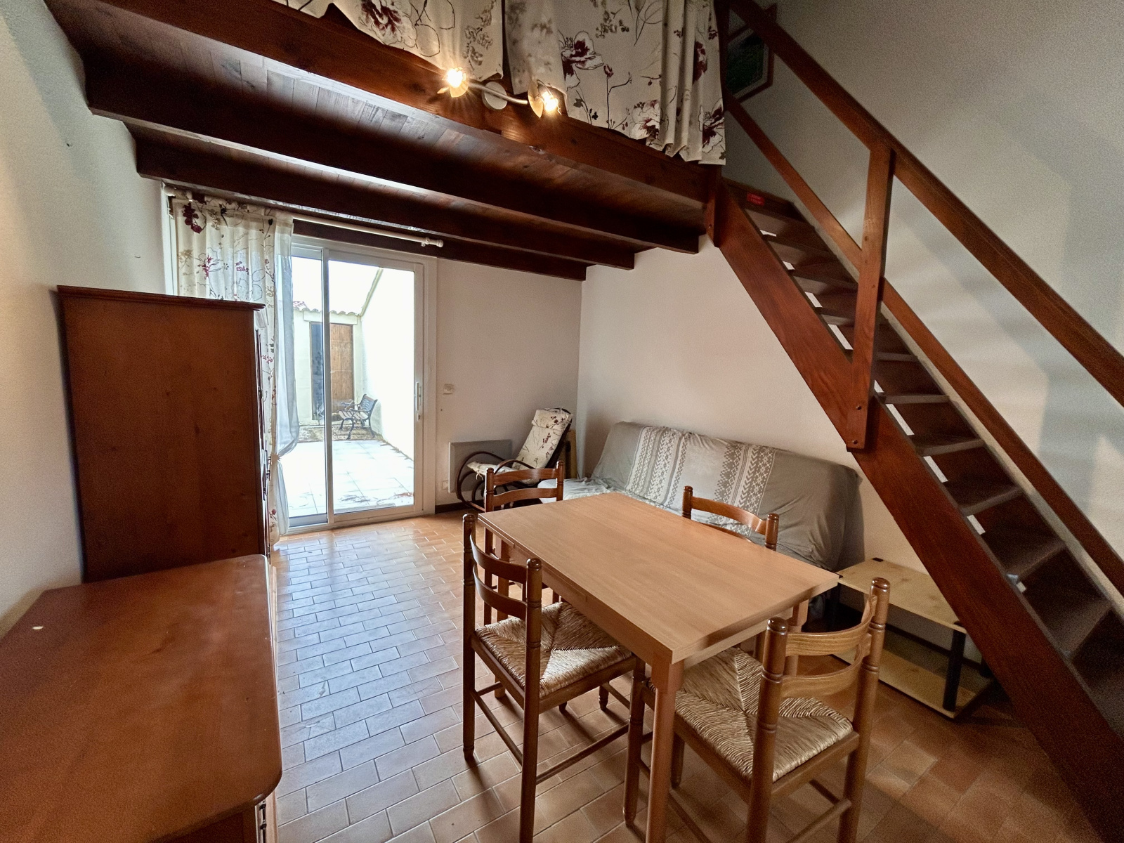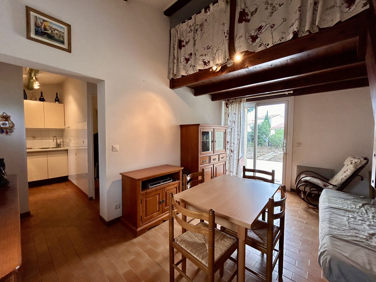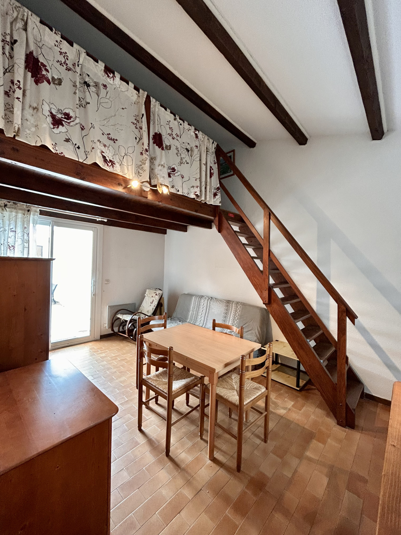 Séjour avec coin cuisine aménagée, une chambre en rdc avec salle d'eau et wc et une mezzanine à l'étage.