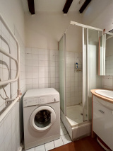 Vous profiterez d'un jardinet avec cabanon et une place de parking privative